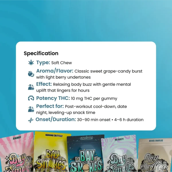 Specifications: Type: Soft Chew Flavor: Classic sweet grape-candy burst with light berry undertones Effect: Relaxing body buzz with gentle mental uplift that lingers for hours Potency THC: 10 mg THC per gummy Perfect for: Post-workout cool-down, date night, leveling-up snack time Onset/Duration: 30–90 min onset • 4–6 h duration Read More