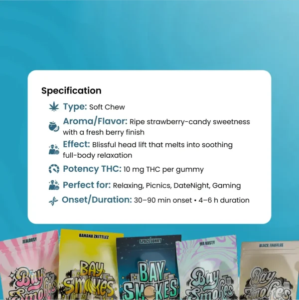 Specifications: Type: Soft Chew Flavor: Ripe strawberry-candy sweetness with a fresh berry finish Effect: Blissful head lift that melts into soothing full-body relaxation Potency THC: 10 mg per gummy Perfect for: Relaxing, Picnics, DateNight, Gaming Onset/Duration: 30 – 90 min onset • 4 – 6 h duration Read More