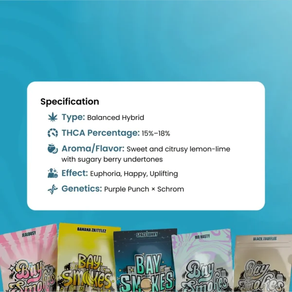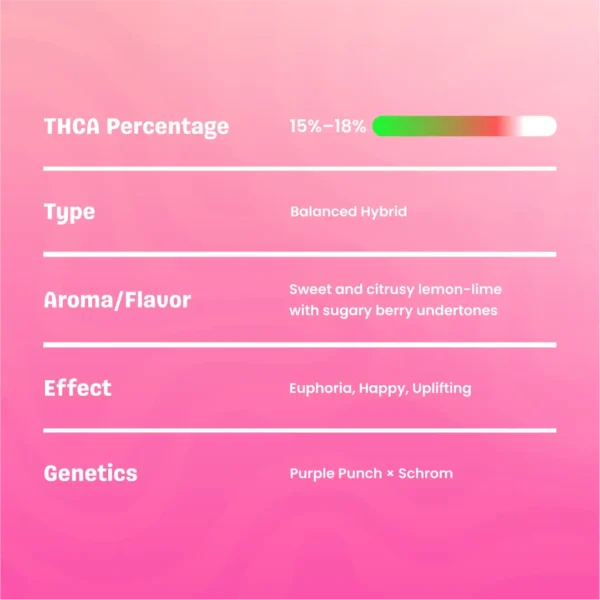 Specifications: Type: Soft Chew Flavor: Sweet and citrusy lemon-lime with sugary berry undertones Effect: Euphoria, Happy, Uplifting Genetics: Purple Punch × Schrom Potency THC: 10 mg per gummy Perfect for: Daytrip, Focus, Social Read More