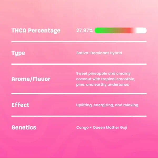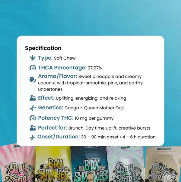 Specifications: THCA: 27.97% Type: Soft Chew Flavor: Sweet pineapple and creamy coconut with tropical-smoothie, pine, and earthy undertones Effect: Uplifting, energizing, and relaxing Genetics: Congo × Queen Mother Goji Potency THC: 10 mg per gummy Perfect for: Brunch, Day time uplift, creative bursts Onset/Duration: 30 – 90 min onset • 4 – 6 h duration Read More
