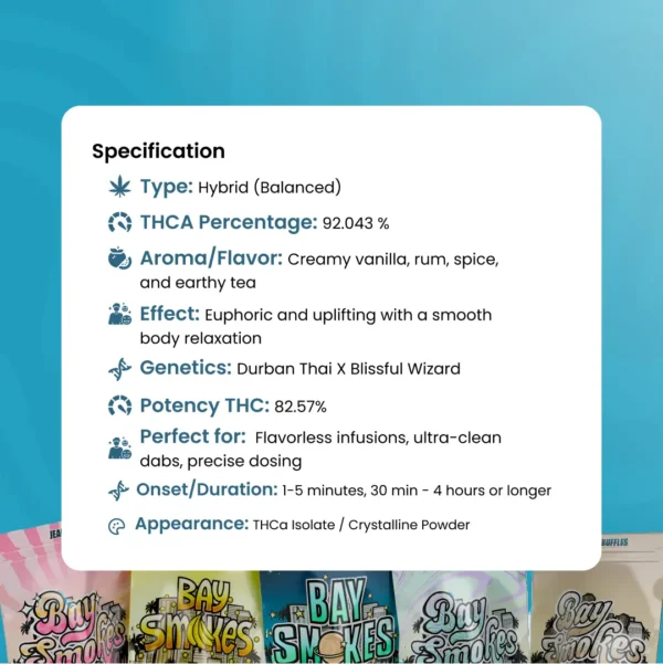 Elevate your cannabis journey with Bay Smokes THCa Isolate Powder—where unmatched purity meets exceptional potency. Perfect for dabbing, infusing, or blending, this premium product is your key to a tailored, high-quality cannabis experience.