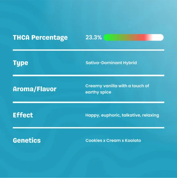 THCA: 22.05% Type: Sativa-Dominant Hybrid Flavor: Creamy vanilla with a touch of earthy spice Effect: Happy, euphoric, talkative, relaxing Genetics: Cookies x Cream x Koolato Read More