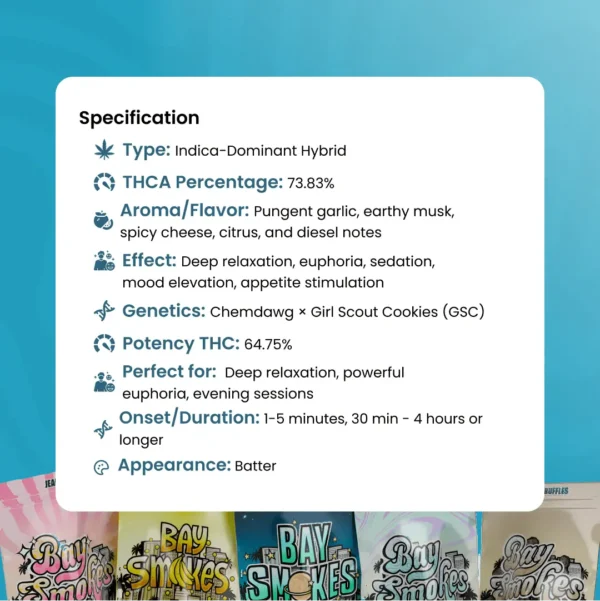THCA: 73.83% Type: Indica-Dominant Hybrid Flavor: Pungent garlic, earthy musk, spicy cheese, citrus, and diesel notes Effect: Deep relaxation, euphoria, sedation, mood elevation, appetite stimulation Genetics: Chemdawg × Girl Scout Cookies (GSC) Potency THC: 64.75% Perfect for: Deep relaxation, potent euphoria, evening unwind Onset/Duration: 1-5 minutes, 30 min – 4 hours or longer Appearance: Batter Read More