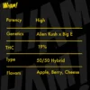 Genetics: Hybrid cross of Alien Kush x Big E, offering a well-rounded profile.