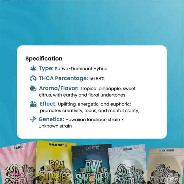 Specifications: THCA: 56.88% Type: Sativa-Dominant Hybrid Flavor: Tropical pineapple, sweet citrus, with earthy and floral undertones Effect: Uplifting, energetic, and euphoric; promotes creativity, focus, and mental clarity; Genetics: Hawaiian landrace strain × Unknown strain Potency THC: 49.89% Form factor of device: 510-thread cartridge (battery sold separately) Perfect for: Creative sessions, focus, daytime energy, social gatherings Onset/Duration: 1-5 minutes onset, 30 min – 4 hours or longer duration Read More