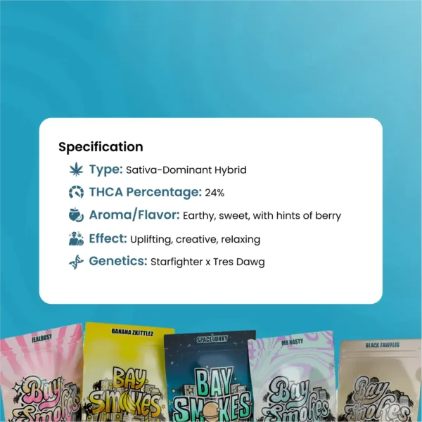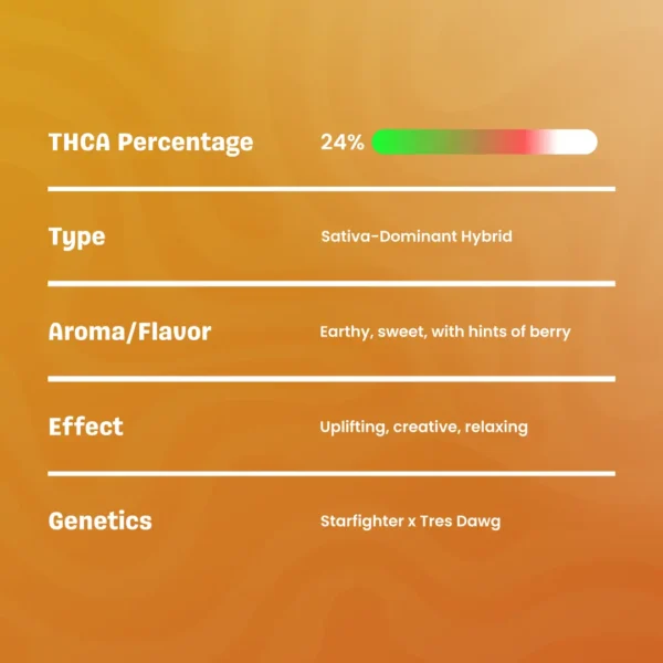THCA: 24% Type: Sativa-Dominant Hybrid Flavor: Earthy, sweet, with hints of berry Effect: Uplifting, creative, relaxing Genetics: Starfighter x Tres Dawg Read More